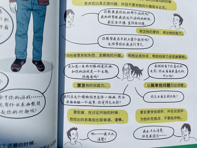 要想和孩子交流起来,就围绕孩子感兴趣的问题展开,多让孩子说,我们扮演一个忠实的观众。比如孩子可能喜欢动漫、喜欢电子产品、喜欢哪个电影明星,我们就和孩子交流这些话题,让孩子当老师,给我们上上课。孩子讲完之后,我们提几个简单的问题,让孩子进一步解释。这样一来,能适当延长交流的时间,也能增加谈话的深度,还能让孩子获得价值感。