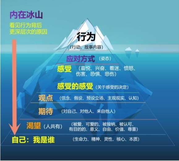 萨提亚家庭治疗中,有一个非常重要的理论叫冰山理论,它指一个人的“自我”就像是一座冰山一样,我们能看到的只是表面很少的一部分,也就是最最表象的行为,而隐藏在冰山之下的应对方式、感受、观点、期待、渴望、自我却很难被发现。
