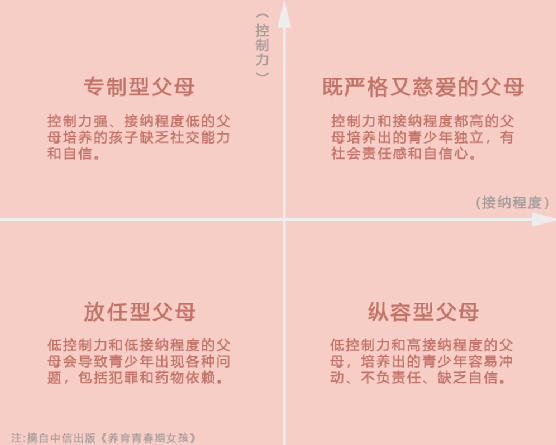 在这个轴的一端,是没有要求、控制力低的父母,而在另一端,是要求苛刻、控制力很强的父母。这两个维度的相互作用,会对青少年产生不同的结果。在理想的家庭中,孩子会从父母那里收到这样的信息:我们爱你,同时,我们也对你抱有期望。