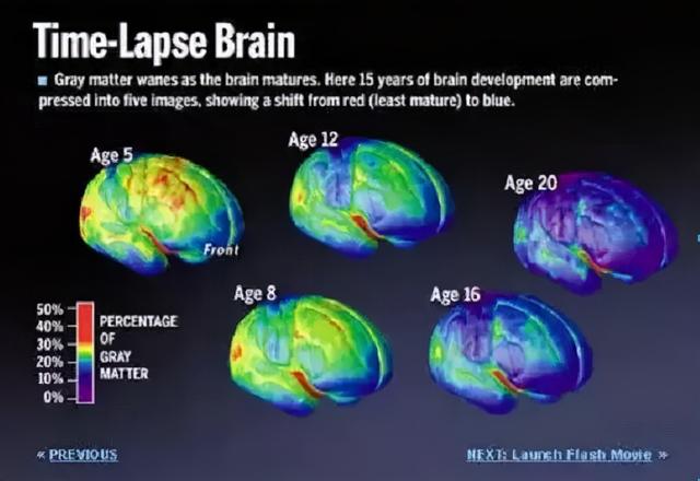 图中的大脑分别是:5岁、8岁、12岁、16岁和20岁。